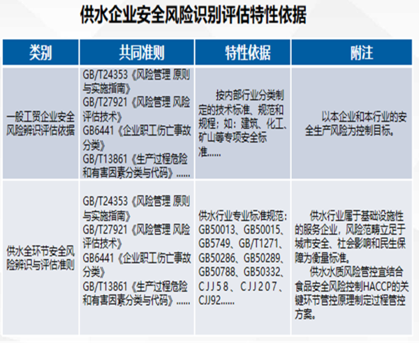 03. 供水(shuǐ)企業(yè)安全風(fēng)險辨識與評估 辨識城(chéng)鎮水(shuǐ)務安全風(fēng)險的(d≥↑e)基本思路(lù) 供水(shuǐ)企業(yè)的(de)安全運行(xíng)直接關乎人( rén)民(mín)群衆生(shēng) §↑∞命安全和(hé)城(chéng)市(shì)經濟發展;因§<此,供水(shuǐ)企業(yè)的(de)安全風®↔♥(fēng)險定義應該源于企業(yè)的(de)功能(néng)與運行(x±♥íng)質量,凡與其沖突危害的(de)因素都(dōδ>'¥u)屬于供水(shuǐ)安全風(fēng)險之列。 除了(le)安全生(shēng)産系統的(de)專業(yè)規$↓☆範标準要(yào)求之外(wài),更多(duō)且更重要(yào¶✔)的(de)還(hái)需要(yào)供水(shuǐ)行(xín€↔&g)業(yè)的(de)安全标準和(hé)行(xí♠≤ng)業(yè)的(de)發展規劃所追求的(de)行(xín¥&±g)業(yè)目标要(yào)求:“牢固樹(shù)立飲用(yòng)水(shuǐ)β©≈®安全保障工(gōng)作(zuò)的(de)整體(tǐ)性概念φ÷,将風(fēng)險管控意識貫穿于飲用(yòng)水(shuǐ)安全保∏✘×→障全過程,構建從(cóng)源頭到(dào)龍頭的(de)全過程飲用(y∑§òng)水(shuǐ)安全保障體(tǐ)系,強化(huà)風(f₽←ēng)險評估、應急預案制(zhì)定的(dφ< e),準确把控和(hé)有(yǒu)效降低(dī)飲用>↑β¥(yòng)水(shuǐ)安全風(fēng≤ ')險。”(引自(zì)《城(chéng)鎮水(shuǐ∑∑)務2035年(nián)行(xíng)業★γ(yè)發展規劃》第2章(zhāng) 飲用(yòng)水(shuǐ)安全)✔÷↓£需要(yào)細分(fēn)供水(shuǐ)環節特點而辨✘&♦£識評估安全風(fēng)險。 一(yī)個(gè)具有(yǒu)安全韌性的(dφ∞e)控風(fēng)險能(néng)力的(de)供水(shuǐ)系統δ>或供水(shuǐ)企業(yè)是(shì)完全能(néng)夠持續實'§₹現(xiàn)安全供水(shuǐ)能(né>>≈☆ng)力的(de);源源不(bù)斷的(de)持續↑&供水(shuǐ),始終保持用(yòng)戶龍頭的(de)合格水£☆£÷(shuǐ)質,并确保所有(yǒu)供水(shuǐ)設施的(ααde)安全運行(xíng)保持與城(chéng)市(shì)環境協調存在; 供水(shuǐ)安全風(fēng)險點與風(fēng)險因子(zǐ)辨識&π¥↑ 縱向:供水(shuǐ)業(yè)務鏈環節中所有(yǒu)的(de)水(shuǐ♦≈₩≤)環境、場(chǎng)所、設備、設施及其工(gōng)藝藥劑…… 按照(zhào)“雙重預防機(jī)制(zhì)”的(Ω♣≈±de)調查分(fēn)析要(yào)求,務必将全業(yè)務εσ♥鏈中的(de)各個(gè)風(fēng)險點全部登入統₹∑ 計(jì)表,然後再辨識危險源(風(fēng±₩ )險因子(zǐ))。 橫向:即為(wèi)每個(gè)風(fē§ng)險點存在的(de)危險源或風(fēng)險因↑≈ 子(zǐ);如(rú)果把某個(gè)取水(shuǐ)泵房∞≤→(fáng)作(zuò)為(wèi)風(fēng)險點,其可( >"kě)以辨識到(dào)的(de)危險源風(fēng)險因子(zǐ)有(yǒ≤♦u):斷電(diàn)失壓風(fēng)險、電(dε£iàn)氣設備升溫火(huǒ)災風(fē∏™ng)險、機(jī)泵超負荷故障風(fēng)險、機(jī)房(fáα¥§ ng)進水(shuǐ)被淹風(fēng)險、進水(shuǐ)€ε管或出水(shuǐ)管爆管風(fēng)險以及取水(shuǐ)水(shuλ✔♣↓ǐ)質突變風(fēng)險等等。 供水(shuǐ)安全風(fēng)險的(d£•e)評估依據與方法 供水(shuǐ)企業(yè)的(de)重要(yào)地(dì)位決定了(le)¶&α™其安全風(fēng)險管控的(de)特殊性和(hé)重要(yào)性,與一¶₹(yī)般工(gōng)貿企業(yè)相(xiàng)比更具複雜(záλλ✔)性和(hé)艱難性。 ![]() 04. “雙重預防機(jī)制(zhì)” 對(duì)供水(shuǐ)企業(yè)風(fēng)險管控原理(lǐ) 對(duì)于供水(shuǐ)安全風(fēng)險的(de)管α&控,應須多(duō)層次思考,首先是(shì)單個(gè)¥®♣♣風(fēng)險因子(zǐ)的(de)預警管控;其次是(shì)整個(g♣≥è)狀态與局面的(de)綜合評估預警管控;第三是(shì)對(duì)所 ™≤₹有(yǒu)設置的(de)控制(zhì)措施檢測預→×警;最後是(shì)某些(xiē)關鍵因子(z'¶λǐ)的(de)預警報(bào)警及應急預φ→案的(de)啓動。 供水(shuǐ)安全風(fēng)險防控≤♥防線 由于供水(shuǐ)安全是(shì)城(chéng)市(shì)運行( ≥xíng)安全的(de)重要(yào)組成部分(fēn),是( ♣★shì)關乎千家(jiā)萬戶民(mín)生(×§shēng)安全的(de)重大(dà)問(wèn)題,在準确掌握全↑ π業(yè)務鏈運行(xíng)風(fēng) €☆險與風(fēng)險因子(zǐ)的(de₹α☆)基礎上(shàng),分(fēn)級分(f<←∞→ēn)類梳理(lǐ)落實對(duì)應的(de)管控措施并按₽☆标準落實到(dào)位。 供水(shuǐ)安全風(fēng)險預警值的(de)科(kē)學設置 關于供水(shuǐ)水(shuǐ)質預警值務必按供水(shuǐ)企業(y✘Ωè)向用(yòng)戶承諾的(de)要(yào)求、國(guó)家(jiā)↕← '标準要(yào)求以及當地(dì)政府主管部門(mén)要(yào)求₩$∏的(de)更高(gāo)标準。 案例:水(shuǐ)廠(chǎng)出水(shuǐ♣ )濁度始終保持在≤0.01NTU,而到(dào)達某個(gè)自(zìσ♥)然村(cūn)以後濁度即會(huì)從(có✘≥§ng)進村(cūn)前的(de)0.4NTU慢(màn€ )慢(màn)上(shàng)升到(dào)0.♦±'"8--1.2NTU,與供水(shuǐ)企業(yè)向用(yòng)戶©α"§承諾的(de)龍頭水(shuǐ)濁度≤1.0NTU産生(shēng <)了(le)差距,會(huì)出現(xià ♣₽§n)長(cháng)時(shí)間(jiān)的(de)報★↕≥(bào)警,需要(yào)在管網系統做(zuò)全面的(de)分(fēn)÷φ析,基本排查外(wài)源性因素,主要(yào)集中于兩大(dà)內(n§ ≠èi)源性問(wèn)題,第一(yī)是(shì)老(lǎo)•§ ≤舊(jiù)管材,亟待更新改造;第二是(shì)需要(yào)改善δφ÷管網布局,改變枝狀供水(shuǐ)局面。使得(d≈'→e)村(cūn)網水(shuǐ)質一(yλ'¥ī)直保持在≤0.8NTU。 在城(chéng)市(shì)向農(nóng)村(cūn)延≥σ≤伸供水(shuǐ)的(de)過程中,需要(yào)特别關注管網水 ↕≥&(shuǐ)質的(de)外(wài)源性風(fēng)險,既有(yǒu'∏')危